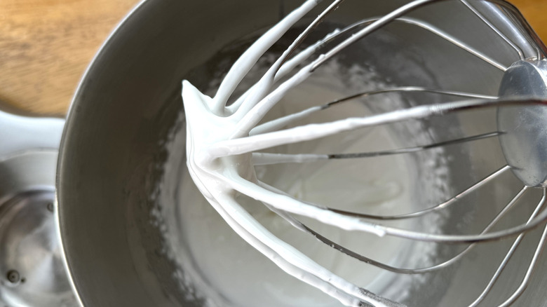 - In the bowl of a stand mixer fitted with a whisk attachment, whip egg whites to soft peaks.