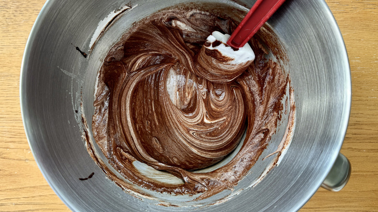- Fold chocolate mixture gently into whipped egg whites until still streaky but combined.