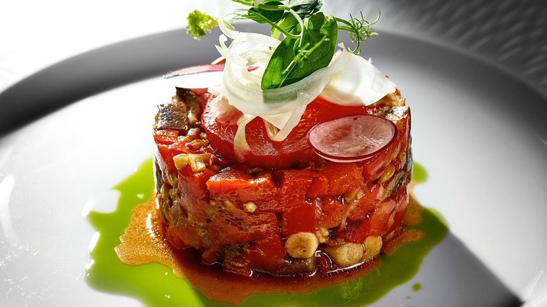 A plant-based tartare may seem like an oxymoron as traditional preparations feature raw meat — most prominently steak. You'll also find tuna tartare and even smoked salmon tartare on restaurant menus as red meat-free versions. However, in step with the age of innovation in plant-forward dining, there's an ingenious version that celebrates the tomato as a star ingredient, thereby leveling up the flavor and adding valuable nutrients like vitamins and antioxidants to the dish. It's imperative to use good quality tomatoes that are in season to ensure optimum flavor. But if you're preparing this luscious tartare when the temperatures drop and tomatoes are not in season, consider opting for smaller varieties to source the best tomatoes out of season.