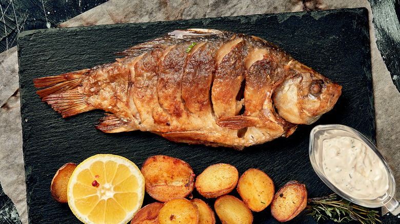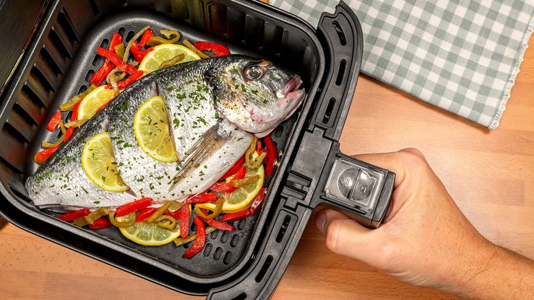 When you're ready to cook your fish, prepping your air fryer is key. Preheat it to between 375 and 400 degrees Fahrenheit and line it with parchment paper to make cleanup a snap. While it's heating, you can clean and season your fish (It's simple to descale fish with a spoon). Since most fish have a mild flavor, consider seasoning it inside and out with salt, pepper, and a little olive oil. Paprika, garlic, onion powder, or chili pepper and lime seasonings are also delicious on most seafood.