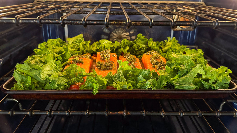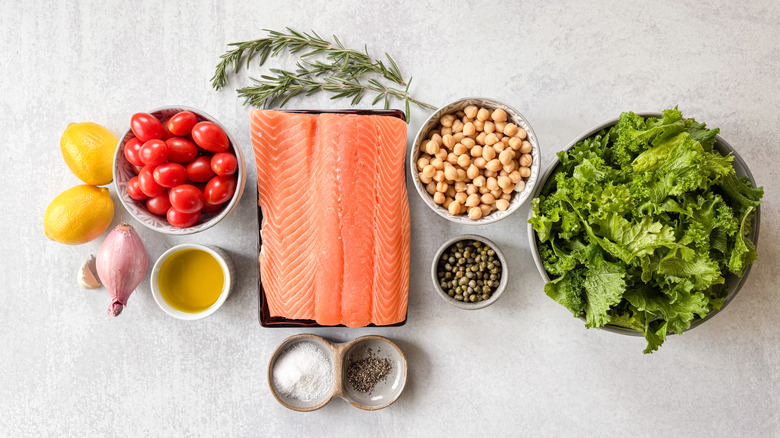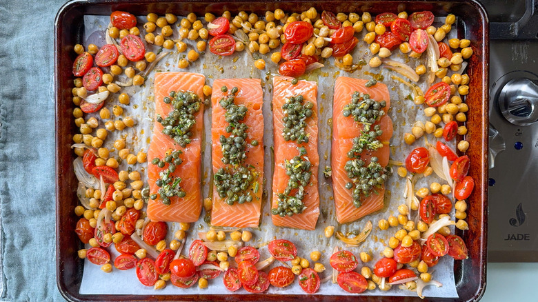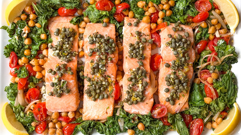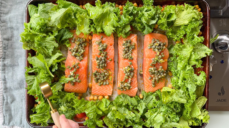 Salmon is one of the most popular fish varieties to prepare and enjoy, and for good reason. Poached, grilled, baked, or raw, salmon can be the star of delicate dishes yet has the right texture and flavor to hold up to spice and more assertive flavors. This recipe for one-pan baked salmon with mustard greens and chickpeas, courtesy of recipe developer Julie Kinnaird, turns skin-on salmon fillets into a zesty and colorful meal, one full bold Mediterranean flavors like capers, lemon, tomatoes, and rosemary. The salmon, chickpeas, and mustard greens all roast together for an easy-to-prepare yet elegant meal any day of the week.