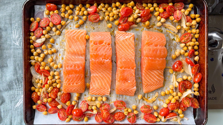 - Push the chickpea mixture to the sides of the baking sheet and place the salmon skin-side-down in the center of the pan.