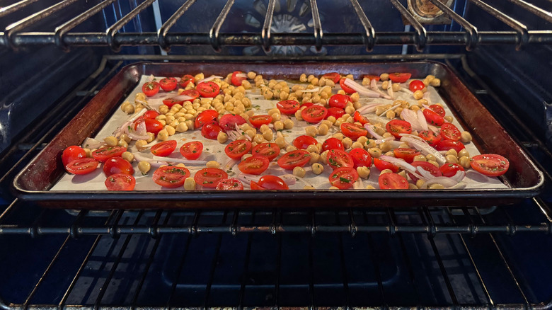- Remove the chickpeas from the oven and reduce the temperature to 325 F.
