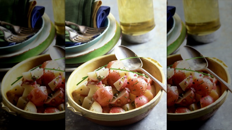 And while Garten doesn't add ingredients like diced chicken to her spud salad, the acidity of the wine white would help if she did. It acts as a tenderizer, breaking down the fats in meat, which is why it's so often used in homemade marinades. If you're cooking along with the Contessa and you typically add chicken, shrimp, and other proteins to your spud salad, that's something to keep in mind.