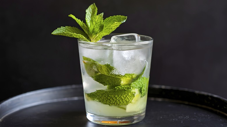 We're back to a refreshing rum-based drink with the Mojito, which has additional components building on the Daiquiri. For a Mojito, you want to combine white rum, muddled mint, lime juice, simple syrup, and club soda. The Mojito originated in Havana when Sir Francis Drake landed in Cuba to plunder the city. While his mission was unsuccessful, some say a drink called the Draque was left behind — either created by Drake himself, or named in Havana to commemorate his visit. The Draque used a cane spirit that was replaced in the 1800s with Bacardi, and the name changed, as well.