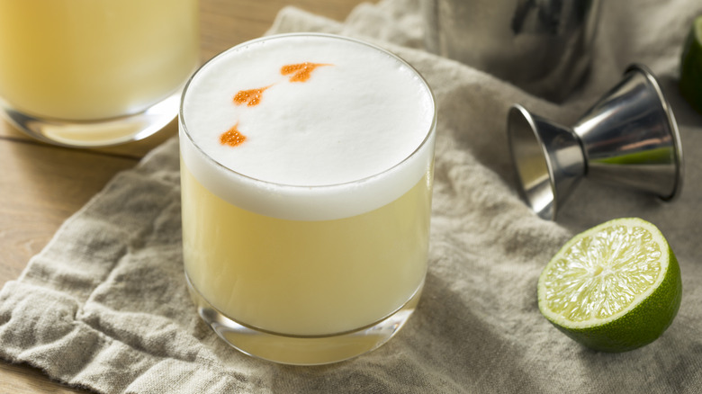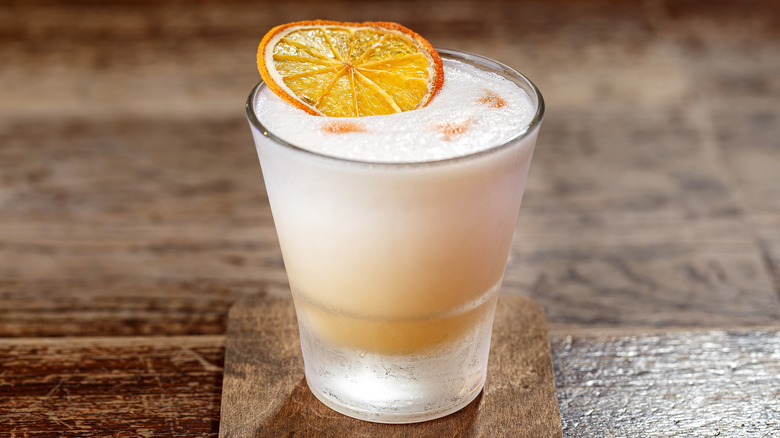 The final cocktail on this list is both straightforward and elevated, which is likely why it's so popular with drinkers. Essentially similar to the Pisco Sour, discussed earlier, the Whiskey Sour contains whiskey, lemon juice, simple syrup, and egg white, with the ingredients mixed without ice before being poured. (Many bars will skip the egg white, but the foam makes it more traditional.) More recently, some bars will add a red wine float, turning it into a New York or Greenwich Sour. You can add a maraschino cherry or orange and bitters on top as garnish.