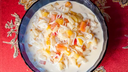However, the real star of buko salad is canned fruit cocktail and sweetened condensed milk. This syrupy, juicy blend of preserved fruits provides a sweet, refreshing base for this dish, while the sweetened condensed milk adds a delectable creaminess. Many believe fruit cocktail and other canned goods became part of Filipino cuisine during American colonization. They were inexpensive, shelf-stable, and fairly tasty, making them popular pantry staples in both nations. Combined with the other traditional ingredients of heavy cream, buko salad became a cold, creamy, and almost soup-like treat that was most frequently served during winter holidays.