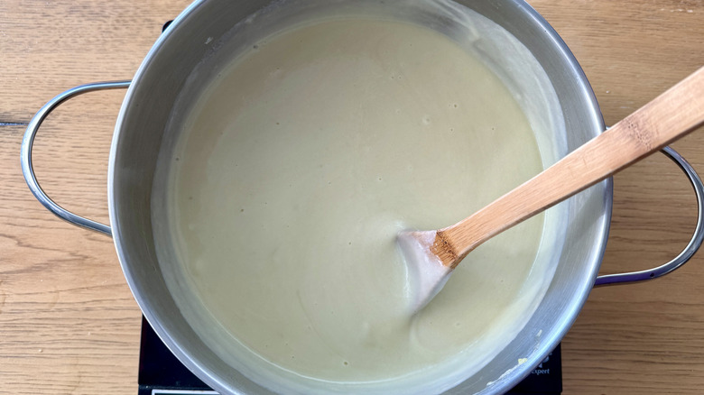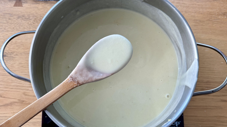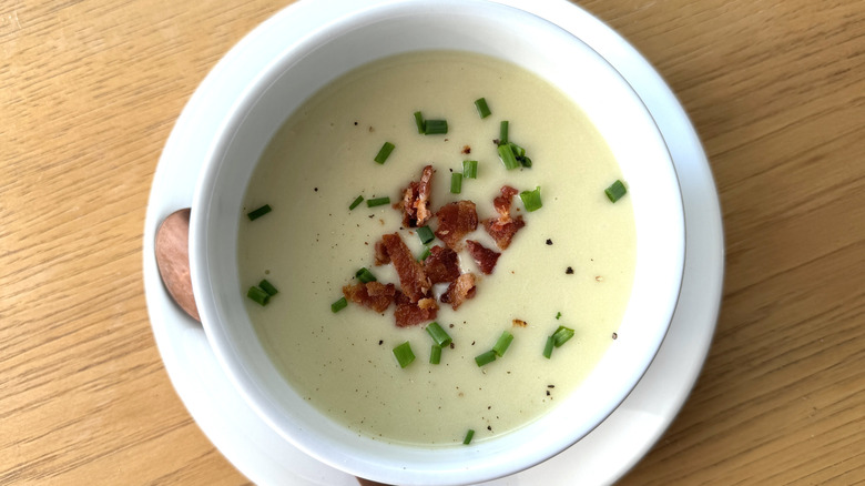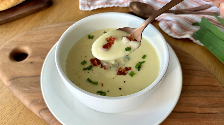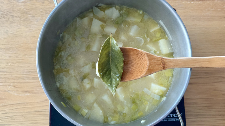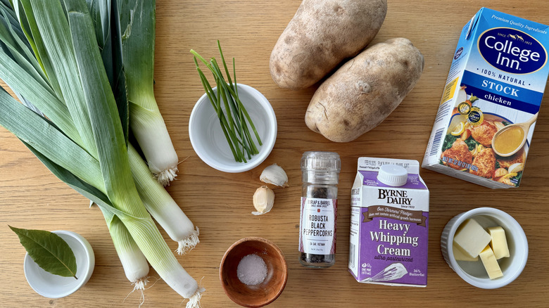 This creamy potato leek soup comes together quickly with pantry staples and only a few specialty ingredients. The most important items are the leeks and potatoes. If you're unfamiliar with leeks, you'll know them by their long, thick stalks and panel-like leaves. Be sure to clean them thoroughly to remove any dirt or debris before using. Rosenhouse opted for russet potatoes for this recipe. Their high starch content helps to create a light and smooth texture in the final soup, reducing the likelihood of gumminess. Unsalted butter and heavy cream add richness to the dish, while chicken stock acts as a liquid base that enhances the savory notes. A hint of garlic adds to the flavor, and a bay leaf adds a subtle herbal note you won't notice unless it's missing. Salt and pepper bring it all together, enhancing the overall flavor of the dish.