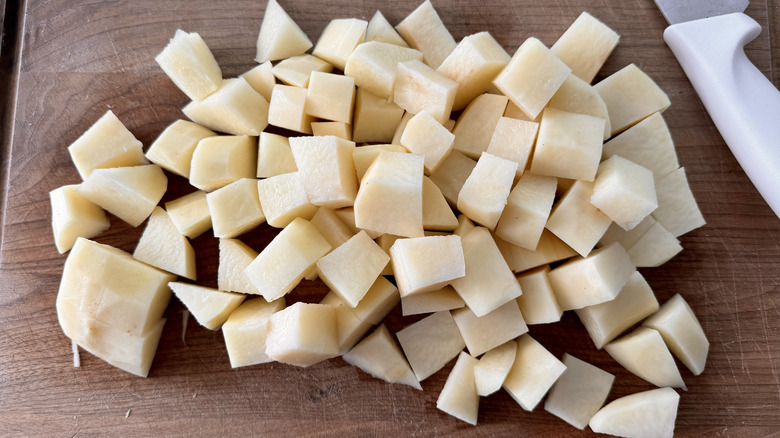 In the meantime, peel and chop the potatoes into 1-inch cubes.
