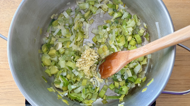 Once the leeks are softened, add the garlic and cook, stirring occasionally, for 1 minute.