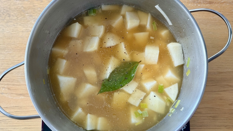 Add the potatoes, bay leaf, chicken stock, salt, and pepper.