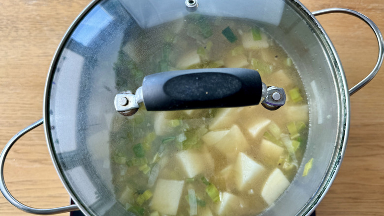 - Cook covered over low heat, stirring occasionally, until the potatoes are fork-tender, about 12-15 minutes.