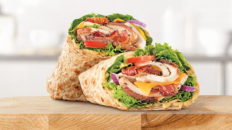 If you head to Arby's and are planning on ordering one of the lower-calorie options, you might want to avoid the chicken. The three highest-calorie menu items are the Crispy Chicken Club Wrap (880 calories), the Turkey, Ranch & Bacon Sandwich (800 calories), and the Sausage Gravy Biscuit-Double (960 calories). Compare that to the Classic Roast Beef sandwich without cheese at 360 calories. Add a slice of cheddar cheese to your roast beef and you're looking at 450 calories, which is still 430 calories less than the Crispy Chicken Club Wrap. And you could eat two of the Classic Beef and Cheddars and still have a lower calorie intake than one Sausage Gravy Biscuit-Double.