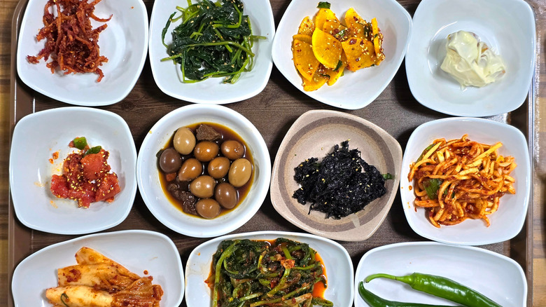 Banchan doesn't refer to one particular dish, but translates from Korean to "side dishes." There are seemingly hundreds of options for banchan, and many are vegetable-based, while some feature egg, chicken, or seafood. There aren't necessarily any preparation rules when it comes to banchan — the dishes can be raw, fermented (like kimchi), sautéed, braised, steamed, or fried. Typically, a table will feature a spread of several banchan, with a harmonious mix of umami, sweet, spicy, and sour flavors. The small dishes are meant to be shared amongst the table.
