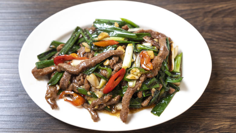 Ginger beef typically consists of thin strips of beef that are battered in a cornstarch and flour slurry and deep-fried. The crispy beef is then tossed with veggies like onions and carrots and coated in a sticky sauce made with ginger, soy sauce, chiles, vinegar, and sugar. It's often served on rice, although you can sometimes get it with noodles. Sadly, the Silver Inn is no longer open, so you won't be able to try the original. However, many other restaurants have picked up the reins and are still carrying on the tradition.