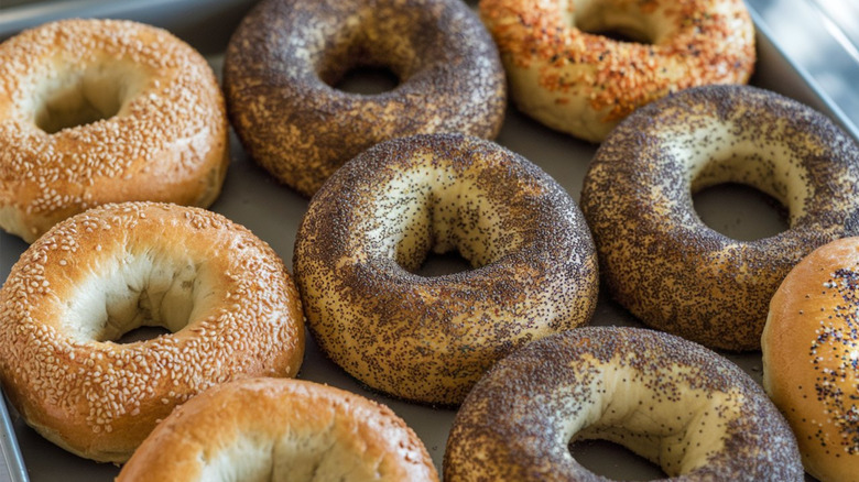 There are several things that set Montreal bagels apart from other versions of these doughy baked goods. For one, they're traditionally made by hand with malt flour. Once the dough is formed into rings, the bagels are poached in honey water and baked in a wood-fired oven. The end result is a somewhat thin bagel with a golden crust, chewy interior, and a slightly sweet taste. They're great eaten as-is, but taste even better when toasted and topped with cream cheese and smoked salmon.