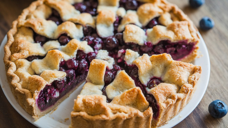 If you spend any time in the Canadian Prairies, there's a good chance you'll come across Saskatoon berry pie. This delectable dessert features Saskatoon berries, which are native to the region and can be found as far north as the Yukon and Northwest Territories and as far south as the northern United States, where they sometimes go by the name juneberries or serviceberries. The dark purple berries look like blueberries but have a unique sweet and nutty flavor that some liken to almonds. They work beautifully when mixed with sugar and a splash of lemon juice, encased in a buttery pie crust.