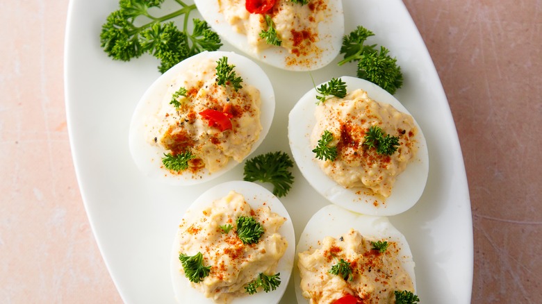 All it takes is adding a couple of steps to your tried-and-true deviled egg recipe. Once you've hard-boiled your eggs, halved them, and remove the yolks, dip the whites into flour, then an egg wash, and finally bread crumbs. Heat a few inches of oil in a large saucepan and fry the eggs until they're a lovely golden brown. Once you've removed them from the oil, pipe in your favorite filling as usual.