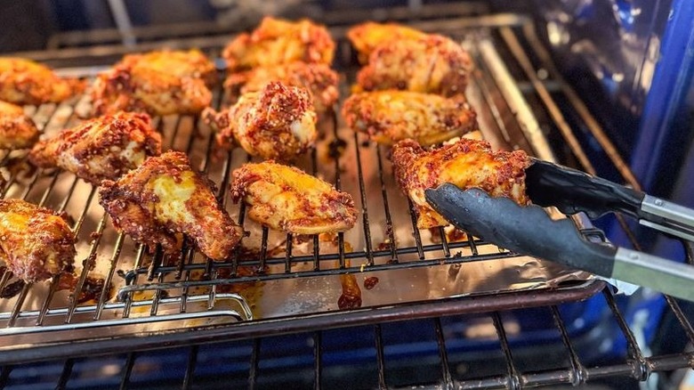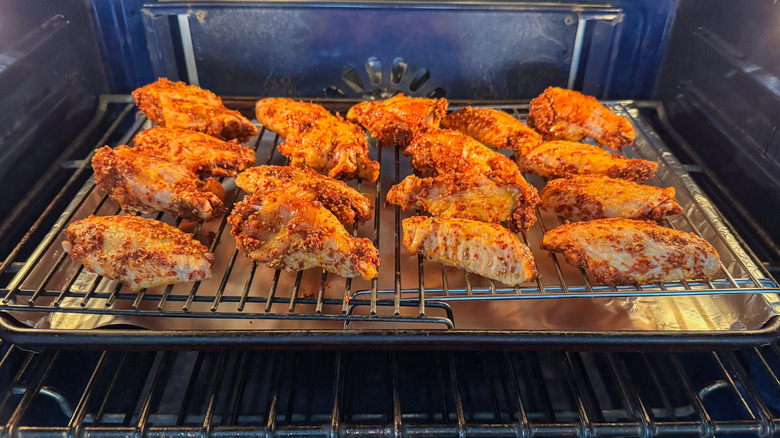 - Remove the chicken wings from the refrigerator and arrange in a single layer on the pan rack.