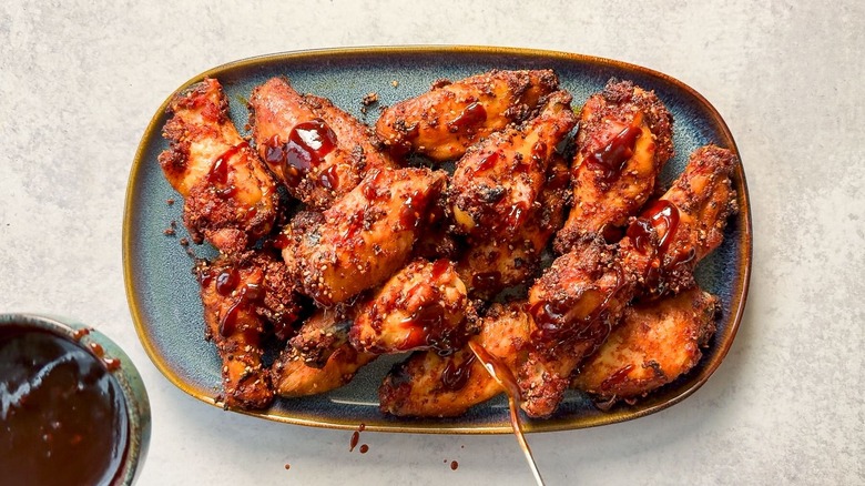 - Place the wings on a platter and drizzle on some of the dipping sauce.