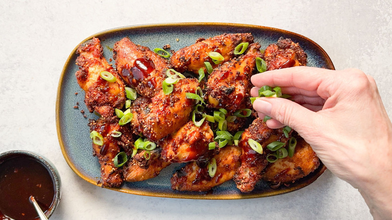 To give yourself a bit of a game-day entertaining advantage, take steps to prepare elements of this recipe in advance. First, cook the dipping sauce up to 2 days ahead, allowing it to cool before refrigerating it in a glass jar or other sealed container. The sauce can be gently reheated over the stove or even microwaved on medium power to rewarm before serving with the wings. The scallion garnish can also be prepared a day ahead and kept tightly wrapped in plastic, a ziplock, or another container in the refrigerator.