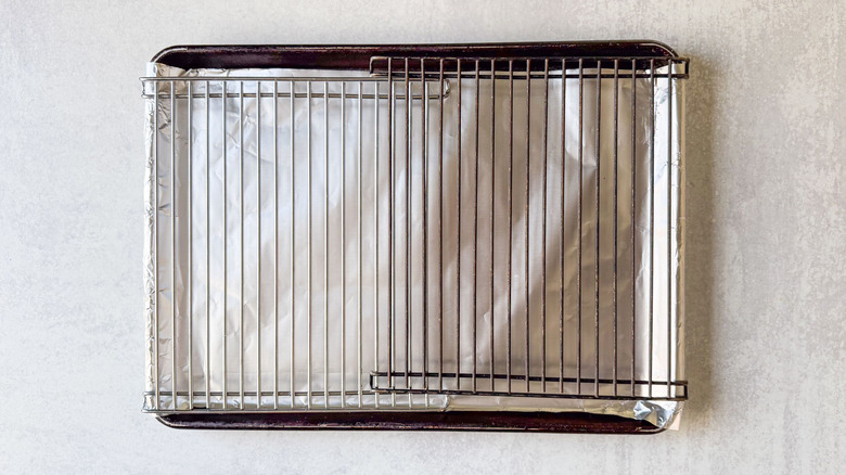 - Line a baking sheet with foil and fit with a rack.