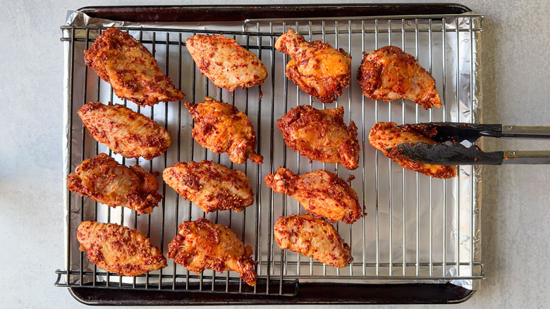 Remove the chicken wings from the refrigerator and arrange in a single layer on the pan rack.