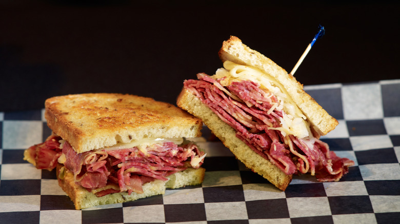 One such history says the Reuben hails from New York, and the other credits Omaha, Nebraska. The NYC story is straightforward: Restaurateur Arnold Reuben owned a deli (also called Reuben's) near the Theater District, and he created it in 1914 for actress Annette Seelos, who was known for starring in Charlie Chaplin films. But there's a catch: Seelos wanted a sandwich that combined lots of ingredients, and the one Reuben devised had ham, turkey, coleslaw, Russian dressing, and Swiss — notably, no beef or sauerkraut.