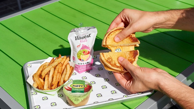Once the logistics have been ironed out, it's smooth sailing to getting those little ones fed — without straining your wallet in the process. So what does a complimentary kid's order at Smashburger look like, exactly? Children can select from three courses to compose their order — either a hamburger, cheeseburger, or chicken strips — and also receive a side offering and beverage. You get to pick between regular fries or regular tater tots, or, request them "smashed" to get them tossed in the restaurant's house garnish (a garlicky topping of rosemary and olive oil). Drinks consist of soft drinks, Honest-brand apple juice, and Horizon milk. If your location participates, it's a great deal all around.