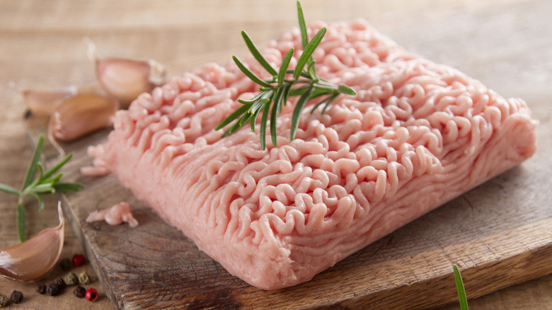 As these two meats are derived from different animals, you may wonder about their distinctions. The truth is, they have a lot more in common than they do in contrast. Since you can even swap out the chicken in chicken tenders with turkey, it's unsurprising that there's a lot of overlap whenever the two proteins are pulverized. Still, there are a few differences to note. Turkey is a bit leaner and generally meatier than chicken, hence its popularity in dishes like turkey burgers. Meanwhile, ground chicken has great moisture retention, and its fat absorbs flavors with greater ease. So, while interchangeable in many dishes, there are a few tailored applications to consider when preparing either of these two affordable meats.