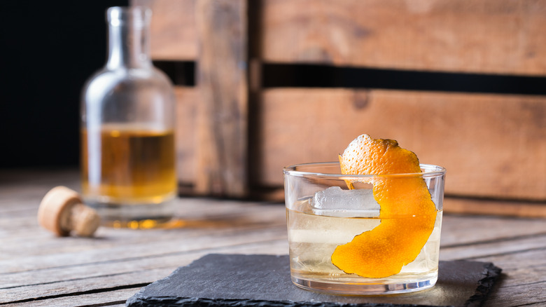If you want to impress your friends, you can hold the peel up to a flame with a match or lighter to release its oils before placing it in the glass. But if it's just a simple night at home, the added flare isn't completely necessary to still enjoy the smoky, citrusy drink.