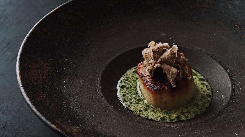 The first dish that Bourdain tried at Catbird Seat was a take on risotto but with sunflower seeds instead of rice. It featured umami-rich Parmesan cheese, fermented sunchokes, and sunflower sprouts. "Insanely delicious," Bourdain said. Next up was a Japanese spin on an Italian sea urchin pasta dish that consisted of wakame seaweed bucatini, citrusy and spicy yuzukoshō to represent chili flakes, and dried smoked scallops grated over top. Bourdain called it "obscenely good" and "completely awesome," even going so far as to say he would happily faceplant in a bowl of it.