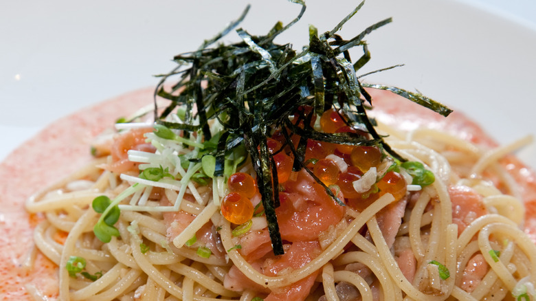 The fusion between Japanese and Italian cuisine is referred to as Wafu-Italian, a method of cooking that combines the rich flavors and techniques of both countries. Tuna cream pasta is a staple meal in Japanese homes and is a prominent by-product of this tantalizing fusion cuisine. The sauce has a delectable cream base and is flavored with sauteed onions, garlic, and toasted black pepper. Right before the cream is thickened into velvety goodness, canned tuna is added and stirred into the sauce. The canned tuna practically melts away into the luscious sauce. Once the cooked pasta is combined, you're left with a perfectly glossy, totally delicious Wafu-Italian delight. The hearty meal is economical, comforting, and extremely tasty. Whenever you want a low-effort meal packed with umami flavor, try making this multicultural, harmonious dish.