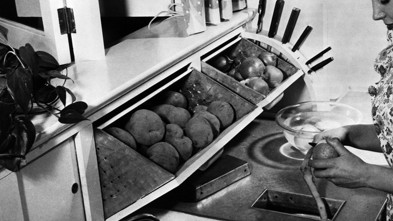 If you're not in the know, properly storing potatoes, onions, or most root vegetables isn't as simple as tossing them into the fridge. Why? The cold, damp environment can alter their flavor and cause them to spoil faster. These staples need to be stored separately in dry, dark, and well-ventilated spaces. Now, you might be wondering, how do you manage this in a modern kitchen? The truth is, it's not always easy, but with the re-popularization of this clever vintage trend, it's absolutely possible! Enter the 20th-century pull-out bins, which were specifically designed to store these types of produce.