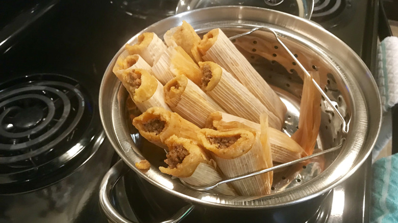 But whether you're experimenting with your own choice of stuffings — meat, beans, veggies, or cheese – or attempting to put together the overlooked tamale variety Rick Martinez wants you to try, how much water does it really take to nail their texture, without making them soggy or too dry? Steaming tamales is all about balance. When using a regular steamer pot, approximately 2-3 inches of water will do the trick. It's just enough to keep them sitting above, as the steam cooks them through over medium-low heat on the stovetop.