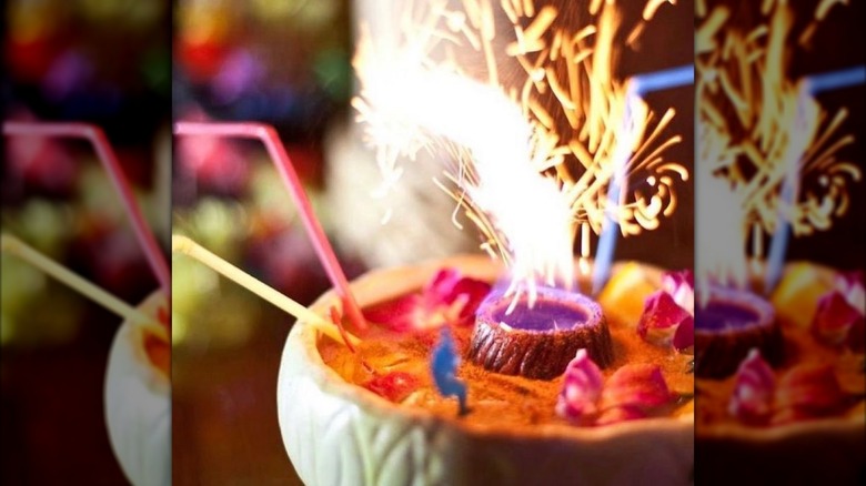 For a classic tiki bar ambiance, head over to Tiki No in Los Angeles and take a sip from the shared "Scorpion Bowl" as the sparkler flames, if you dare. This rum cocktail is a whopping 32 ounces, and you can even upgrade to the larger 38-ounce bowl. It is made of three types of rum plus falerno syrup to give it a sweet tropical heat. Passionfruit, lime juice, pineapple juice, and grapefruit juice bring in some fresh citrus flavor, while cinnamon adds extra warmth. Angostura bitters round out the drink that comes with little umbrellas, flower garnishes, and multiple straws. The grand finale comes when the inside bowl erupts in sparkling flames.