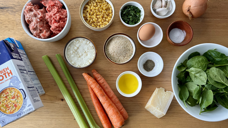 The soup itself is made of carrots, onion, celery, spinach, garlic, chicken broth, ditalini, olive oil, salt, and pepper. For the meatballs, you'll also need ground beef, sweet Italian sausage, Parmesan cheese, parsley, panko breadcrumbs, and egg.