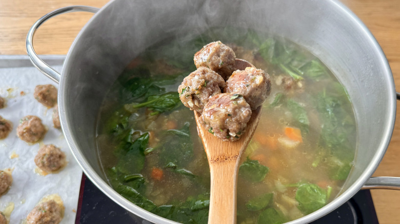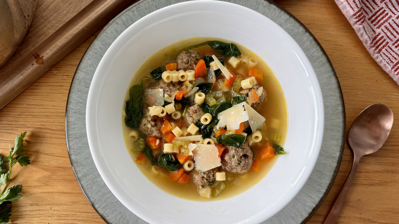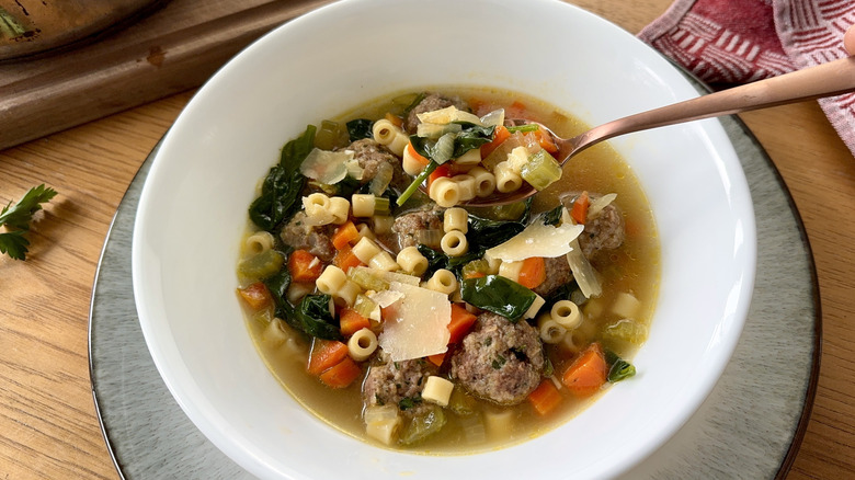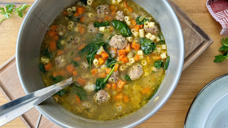 Italian wedding soup and minestrone are two of the best-known (and dare we say, best-loved) types of Italian soups, but they do have their differences. Italian wedding soup is usually broth-based and is typically made with chicken stock as is the case with this recipe. It generally also contains some type of greens such as escarole or kale — here we're going with spinach. In fact, its Italian name, "minestra maritata," translates to "married soup" and refers to the harmonious balance between meat and vegetables. (We're not sure where the pasta comes in, but maybe it represents the soup's offspring?)