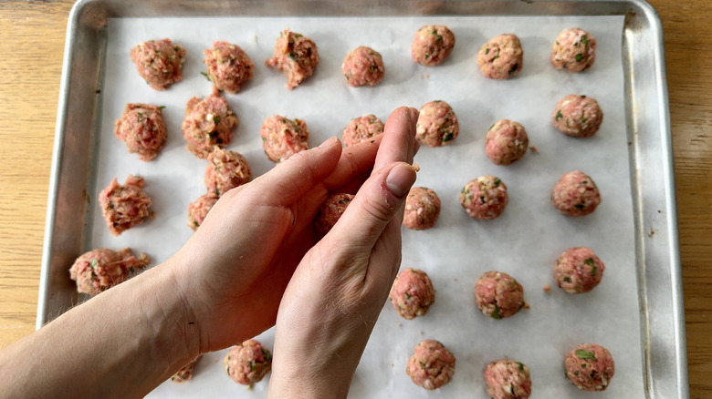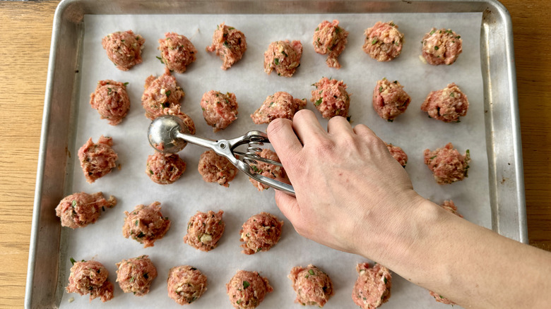 - Use a 1-inch scoop to portion meatballs onto the prepared baking sheet, spacing apart.