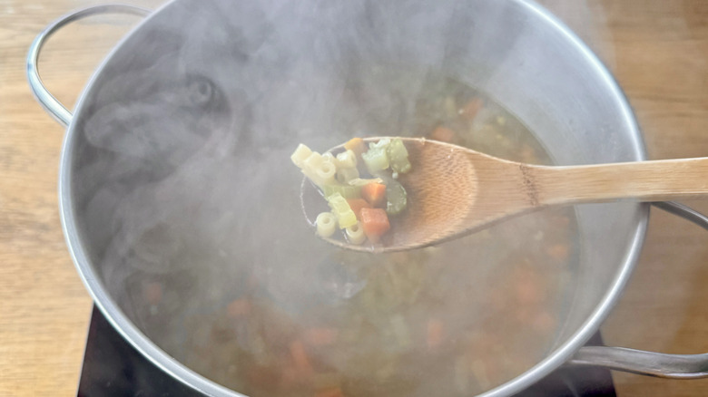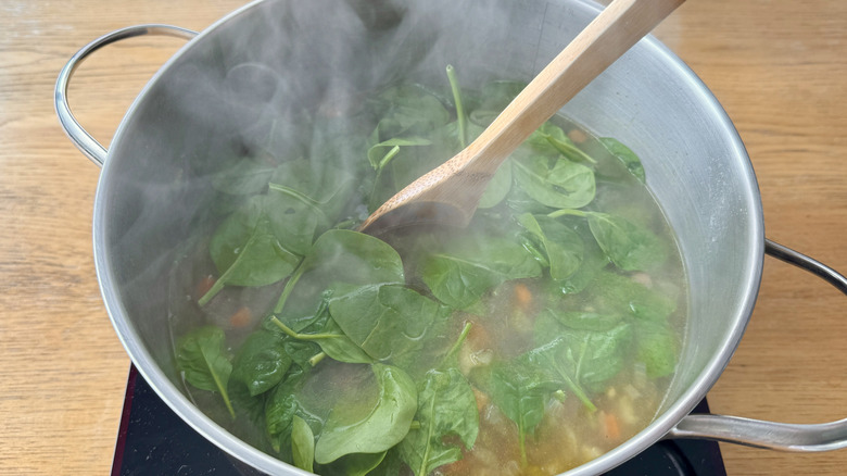 As mentioned above, Italian wedding soup can be made with different kinds of greens, so feel free to swap the spinach out for endives, escarole, kale, or even cabbage. You could also omit the other vegetables as these aren't always included in this type of soup. Conversely, you could feel free to sneak in some more veggies if you wish, since they certainly aren't going to do it any harm. The pasta, too, is something you can change. Here we're going with the small, tubular-shaped noodles called ditalini, but Italian wedding soup often calls for acini de pepe, which is tiny and round and shaped like the peppercorns from which it takes its name. Orzo or couscous are other tiny pasta options that would also work in this soup.