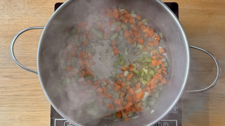 - Add carrots, onion, and celery and stir to coat. Cook over medium heat, stirring occasionally, until veggies are slightly softened.