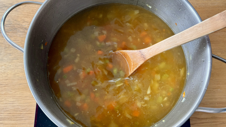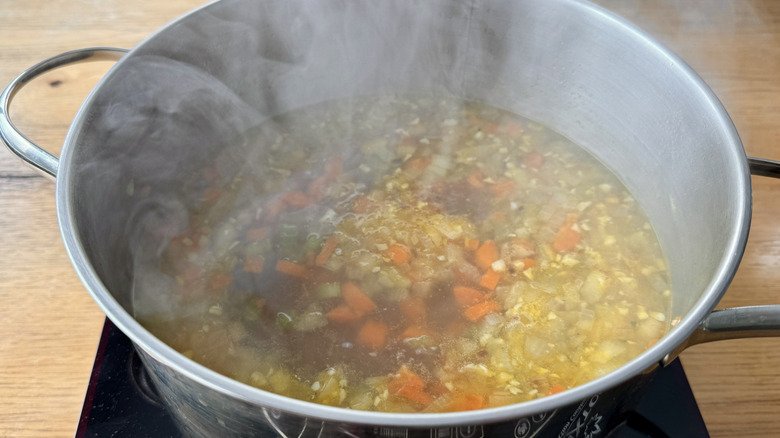 - Bring to a boil, then lower the heat and simmer until the veggies are softened, about 20 minutes.