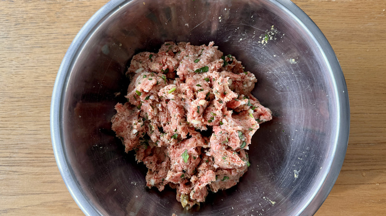 - Prepare the meatballs: In a bowl, mix to combine ground beef, sausage, Parmesan, parsley, breadcrumbs, egg, garlic, salt, and pepper using gloved hands.