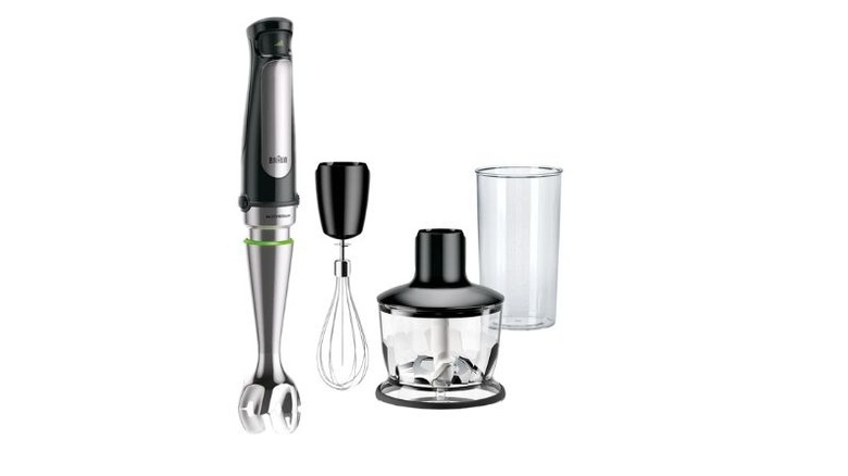 The Braun MulitQuick 7 hand blender is another great option if you want a small task master for blending and chopping. The trigger-style power button where the speed is controlled by the pressure you apply is similar to other immersion blenders and comfortable to grip when blending. For around $100 you get the blender wand, a whisk attachment, a 2-cup chopper, and a blending cup. A unique feature of this hand blender is the "ActiveBlade" technology, which means the blade moves up and down while spinning. Braun claims this increases the active cutting surface area for a smoother and faster blend.