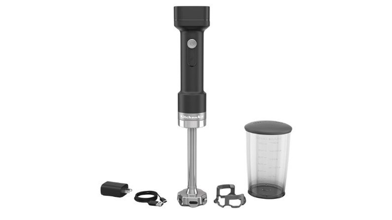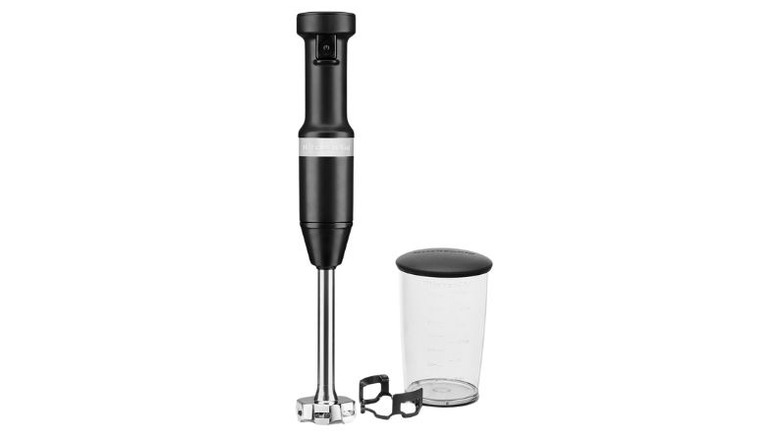 The Kitchenaid variable speed immersion blender (with a cord) is another popular option under $100. This blender is great for those who aren't looking for extra attachments since this one comes with just the blender arm and a blender jar with a lid so you can store any leftovers in the fridge in the same cup. The blender arm is dishwasher safe so you have one less dish to hand wash and features a removable pan guard.