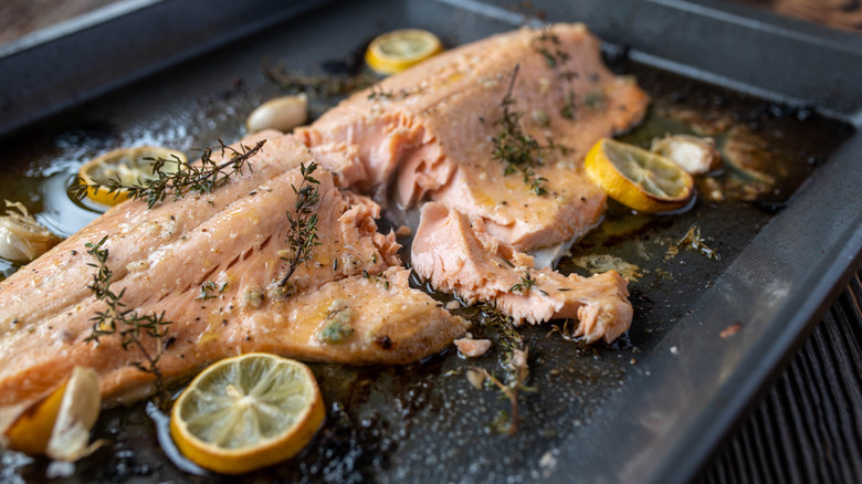 Some home chefs out there prefer to eat fish that doesn't taste, or smell, too overwhelmingly fishy. While the primary flavor is ultimately going to come down to the kind of fish you cook — and the spices and/or sauces you pair it with — if you're looking to make sure your kitchen doesn't smell like a marina for the 48 hours directly after serving up salmon, there's a simple trick you can use to reduce any lingering smells.