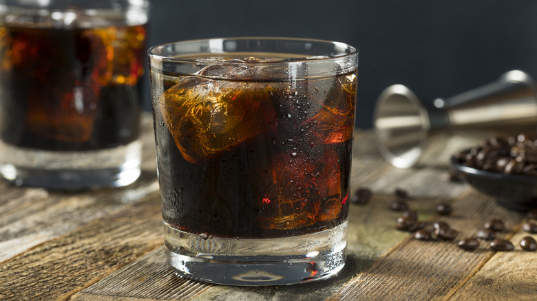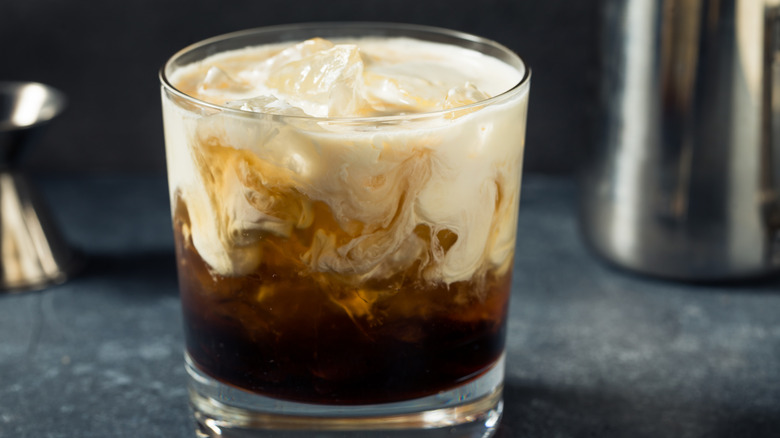 The White Russian has not much to do with Russia, except for the use of vodka in the recipe. It's a creamy cocktail that blends vodka, coffee liqueur, such as Kahlua, and heavy cream; half-and-half can be used in a bind. Served over large chunks of ice in a rocks glass, it has a rich, dessert-like quality. And yes, vegans can make this drink with coconut milk. White Russians come served with the cream separated from the vodka and liqueur — it's a pretty sight — but be sure to give it a good stir before sipping.