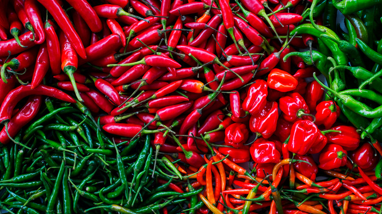 If you're afraid of a bit of spice, be sure to check giardiniera labels — most are sold labeled as either mild, hot, or spicy, sometimes raising the level to extra spicy or extra hot. The type of pepper added determines the spice level; in the vast world of hot peppers and chiles, only a select few are normally used for giardiniera. Chicago-style giardiniera tends to be spicier than traditional Italian blends, often using sport peppers. These small, thin green peppers have a sharp heat and are also eaten on Chicago hot dogs.