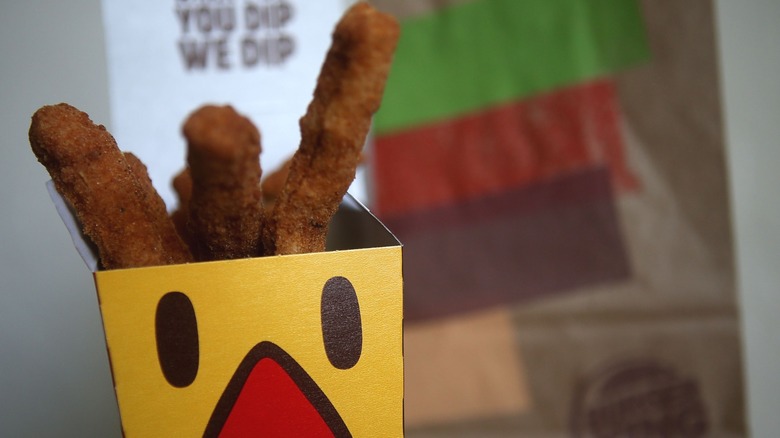 Chicken fries aren't similar in taste or ingredients to french fries. They just have the same french-fry shape, which is how they got their name. According to Burger King's website, chicken fries are actually made of 100% chicken breast — no potatoes to be found. Flavor-wise, they taste similar to chicken nuggets or chicken tenders. They're longer and skinnier than tenders, which makes them perfect for dipping but full of chicken nugget flavor.
