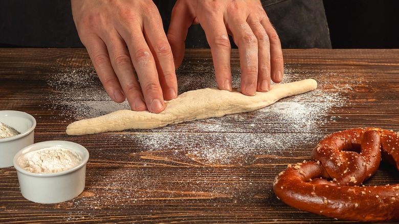 If you consider yourself a culinary novice, making soft pretzels from scratch can be an overwhelming task. When you're in the mood for a chewy salt-covered snack and Costco's prepared pretzel rolls aren't always available (though they haven't been discontinued), mixing and kneading your own homemade dough doesn't exactly seem appealing. Luckily, you can use pre-made, refrigerated pizza dough to make perfectly chewy pretzels in no time. All you need to do is divide the dough into even portions, shape into pretzels, and prepare accordingly.